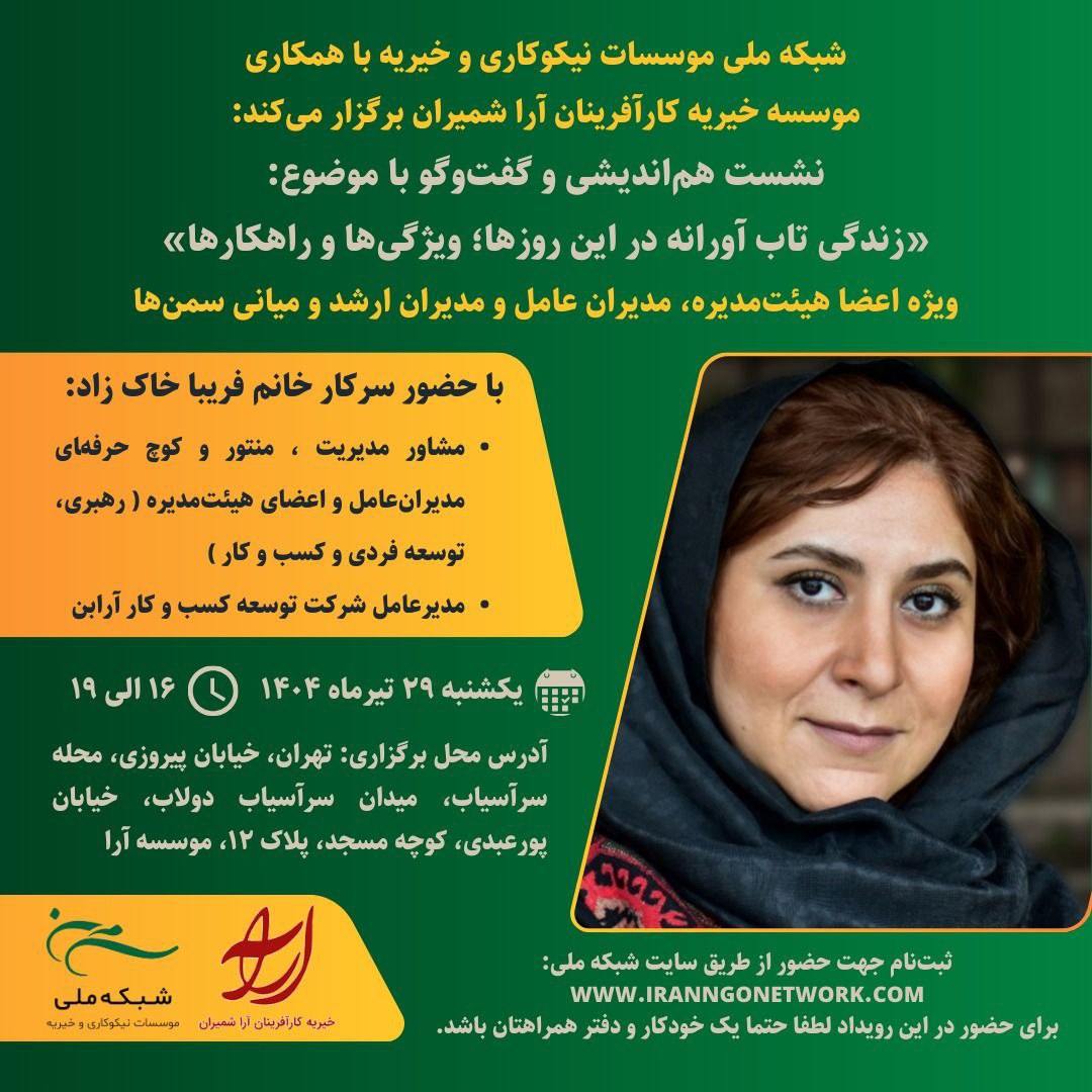 شبكه ملى موسسات نيكوكارى و خيريه با همكارى موسسه خیریه کارآفرینان آرا شمیران، نشست هم اندیشی و گفتگویی با موضوع “زندگی تاب آورانه در این روزها؛ ويژگی ها و راهكارها” را با تدریس و منتورینگ فریبا خاکزاد در تیرماه 1404 در سالن همایش موسسه آرا برگزار نمود.
